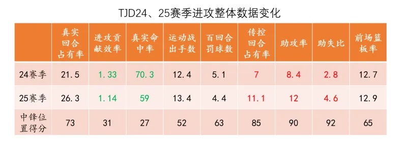 我们首先来看看TJD生涯两个赛季的高阶数据变化,从上图中可以明显感受到相对于24赛季、25赛季的他在高阶数据上出现了全面下滑,相较之下防守端影响力的下滑比较轻微,甚至EPM防守还有提升;但是进攻端的下滑是相当明显的,EPM进攻下降1.1、LEBRON进攻下降0.8、BPM进攻下降1.2,下滑的幅度不止一个档次,所以我们先从他的进攻数据看起: