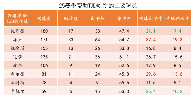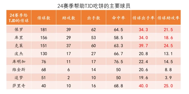 作为一名吃饼型中锋,在没有明显身体问题的前提下吃饼效率的大幅下滑大概率与“球场空间环境变化及核心持球人的变化”有关,所以我们来分别看看24和25赛季给TJD大量传球的队员名单:
