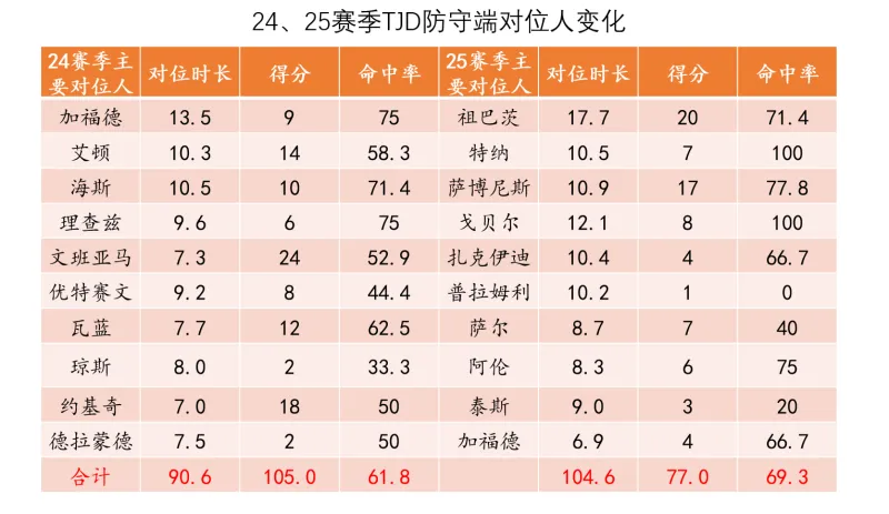 上图是过去两赛季TJD防守端对位时长前10的球员名单,可以看到24赛季TJD主要对位的以吃饼型中锋为主,只有文班、瓦蓝和约基奇三人是进攻端的核心中锋定位且对位时长不高,但25赛季对位前3名的就包括祖巴茨、特纳和小萨三个难以对付的进攻型中锋,难度陡增。