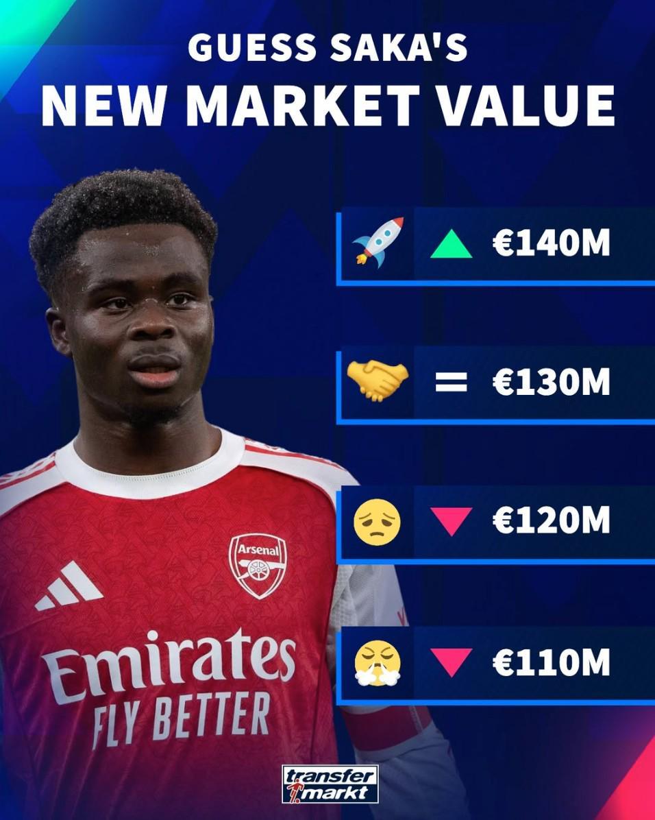 北京时间3月5日,德转预热了萨卡的身价更新,最高涨至1.4亿欧元,最低1.1亿欧元。
