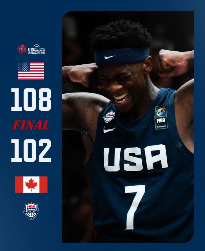 美国U19男篮108-102险胜加拿大U19男篮晋级半决赛,这场比赛美国队与加拿大队打得非常胶着,上半场打完美国领先7分,第三节打完加拿大缩小到1分,末节两队僵持到最后一刻,终场前2分41秒加拿大只落后2分而已,决胜时刻还是球队领袖迪班萨挺身而出,他不断突破制造杀伤以罚球帮助球队取胜。