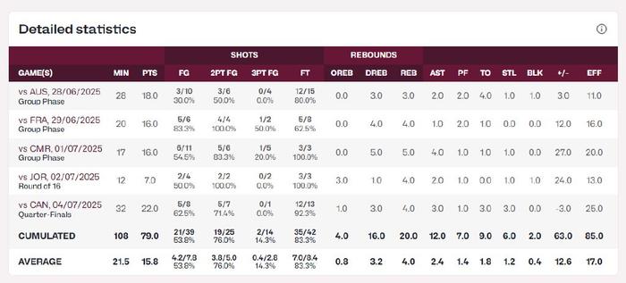 此役迪班萨打了22分钟,8中5,罚球13中12,拿到22分4篮板3助攻3抢断,命中率62.5%,他整个末节是8罚7中,世界杯罚球命中率高达83.3%,美中不足是三分球14中2。